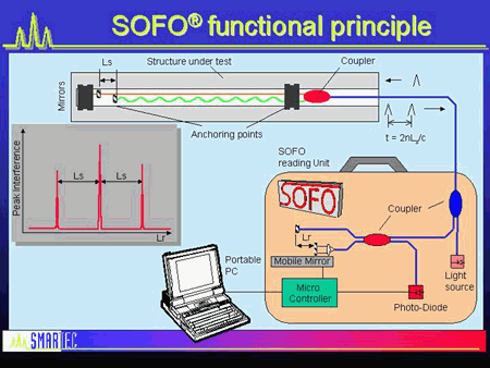 它基于與點光傳感器部分所述相同的白光干涉測量基本原理以上。來自白光源的光通過光纖傳輸到光學傳感器。這里的傳感器由一個光纖耦合器組成,該光纖耦合器分成兩根不同長度的光纖,每端都有一個微型鏡子。參考該配置作為Mach-Zehnder或傳感干涉儀。入射光脈沖由耦合器分成兩個脈沖,并且在返回時,兩個脈沖在時間上分開t = 2nLs / c,其中n表示玻璃纖維的折射率,Ls 表示纖維的長度差異和c光速。一根光纖連接到被測結構上,而另一根光纖非常接近但沒有連接。結構的變形導致路徑差2nLs 的變化。在這種情況下,它通過使用掃描移動設備來測量